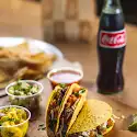 Soft tacos loaded with your choice of grilled chicken, steak, carnitas, or sofritas, topped with lettuce, tomatoes, cheese, and sauces. Served with crispy chips, creamy house-made guacamole, and fresh salsa. Perfect for sharing or solo dining.