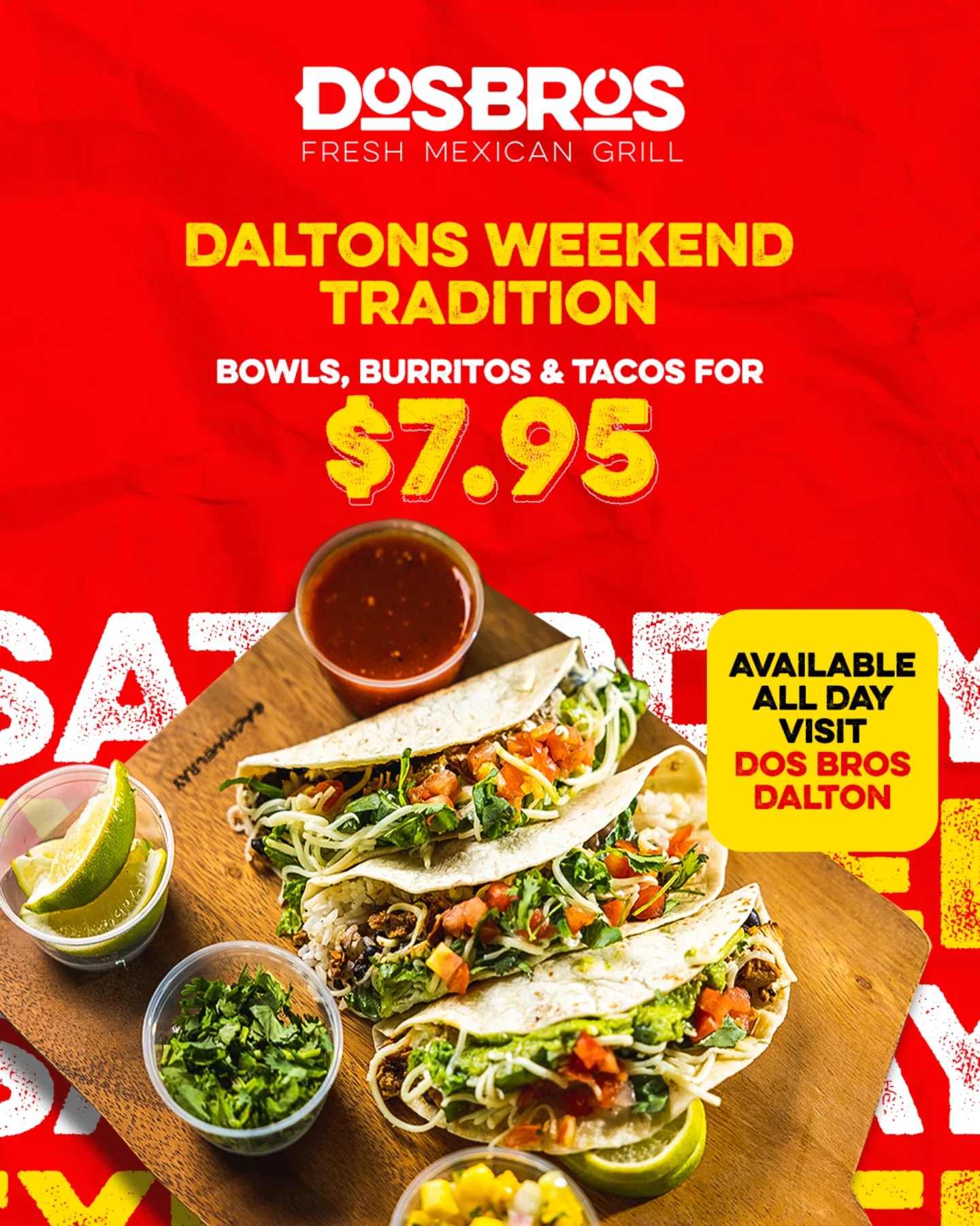 Craving authentic Mexican food in Dalton? Grab fast pickup or get delivery from DosBros Fresh Mexican Grill, where every burrito, bowl, and taco is built fresh to order. Find our Dalton location on Google Maps.
